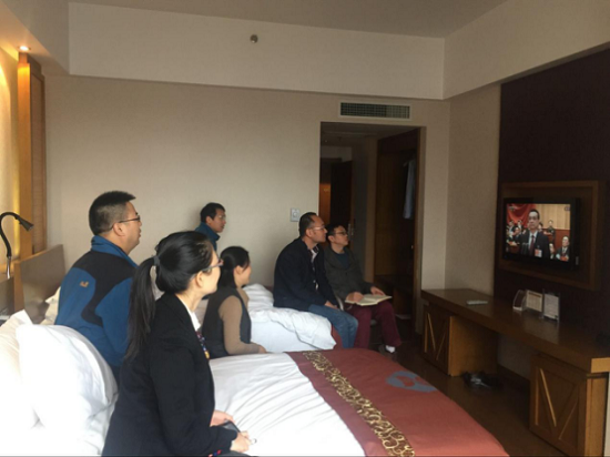 出差人员在宾馆房间集中收看十九大开幕盛况