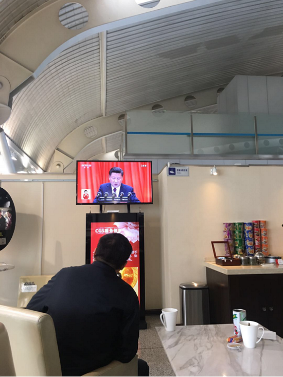 出差人员在机场候机厅收看十九大开幕盛况